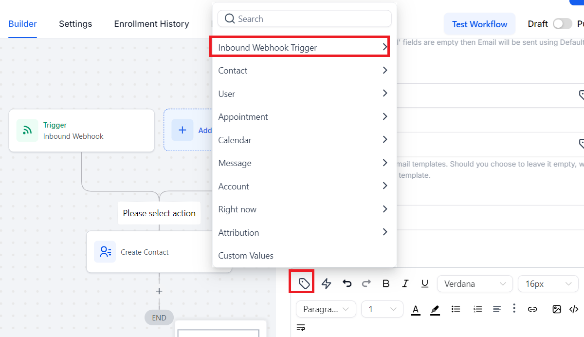 • In “Message” section, click “Custom Values” Button showing below, a window is popped up, choose “Inbound Webhook Trigger”
